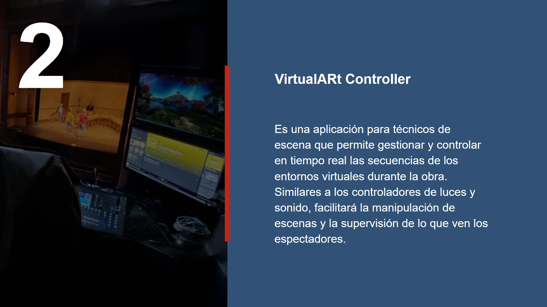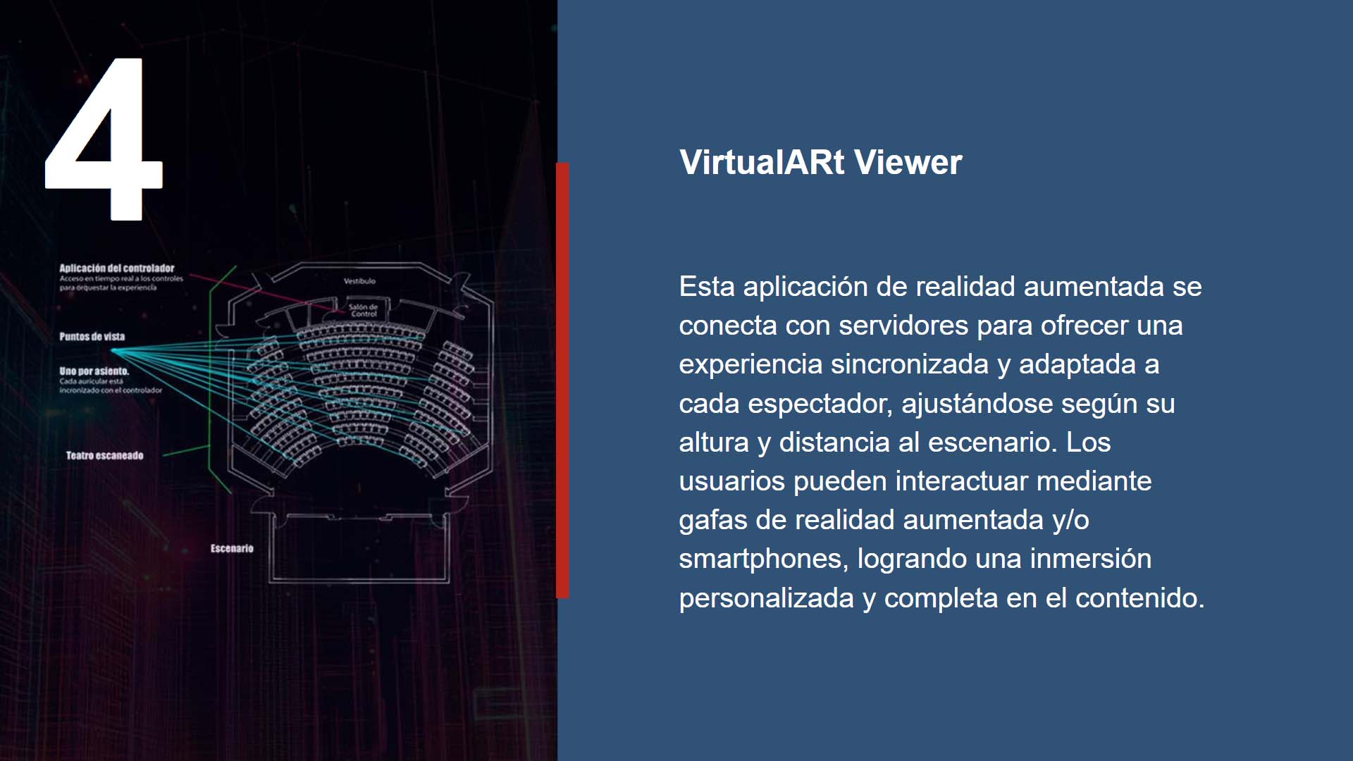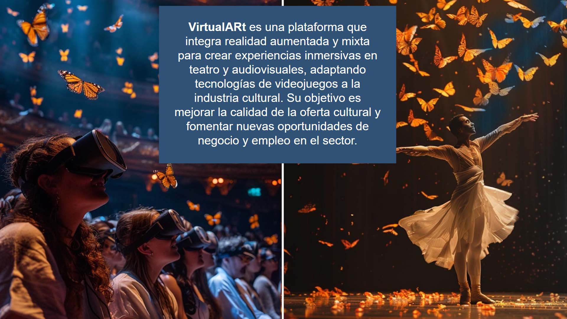 VirtualARt is a suite of innovative tools designed to enable theaters and audiovisual production companies to create immersive experiences using augmented and mixed reality (AR/XR). It integrates 3D animation, advanced engineering, and augmented reality to facilitate the creation of interactive scenes and worlds in theatrical productions or to transform existing audiovisual works, such as movies or short films, into participatory stage experiences.