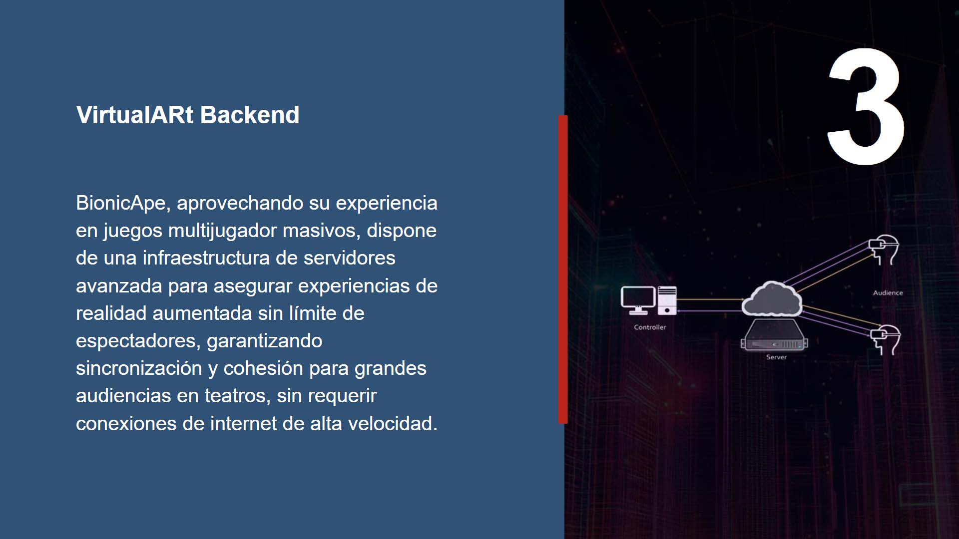 BionicApe, utilizing its expertise in massively multiplayer games, boasts an advanced server infrastructure designed to deliver limitless augmented reality experiences to spectators. This setup ensures synchronization and cohesion for large theater audiences without the necessity of high-speed internet connections.